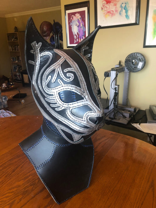Genuine Leather Cat Mask with Intricate Stitched Design and Features